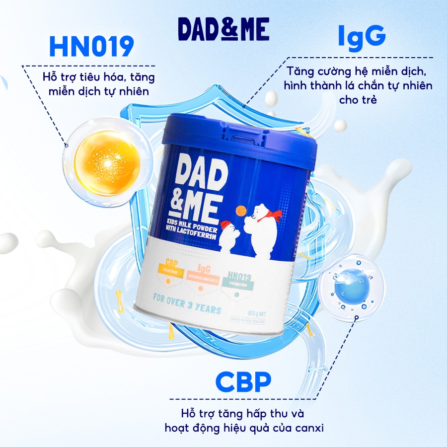 Sữa bột Dad&Me 800g là thực phẩm bổ sung dinh dưỡng cao cấp nhập khẩu 100% từ New Zealand, được nghiên cứu đặc biệt cho trẻ từ 3 tuổi trở lên – bổ sung CBP (Đạm sữa non), Lactoferrin, Probiotic. Mang đến giải pháp toàn diện hỗ trợ bé phát triển chiều cao, tăng cường sức đề kháng, hỗ trợ tiêu hóa và bảo vệ thị lực.